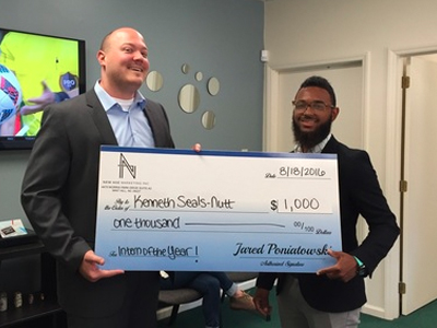 September 1, 2016CEO Jared Poniatowski presents the intern of the year scholarship award to Kenneth Seals-Nutt.